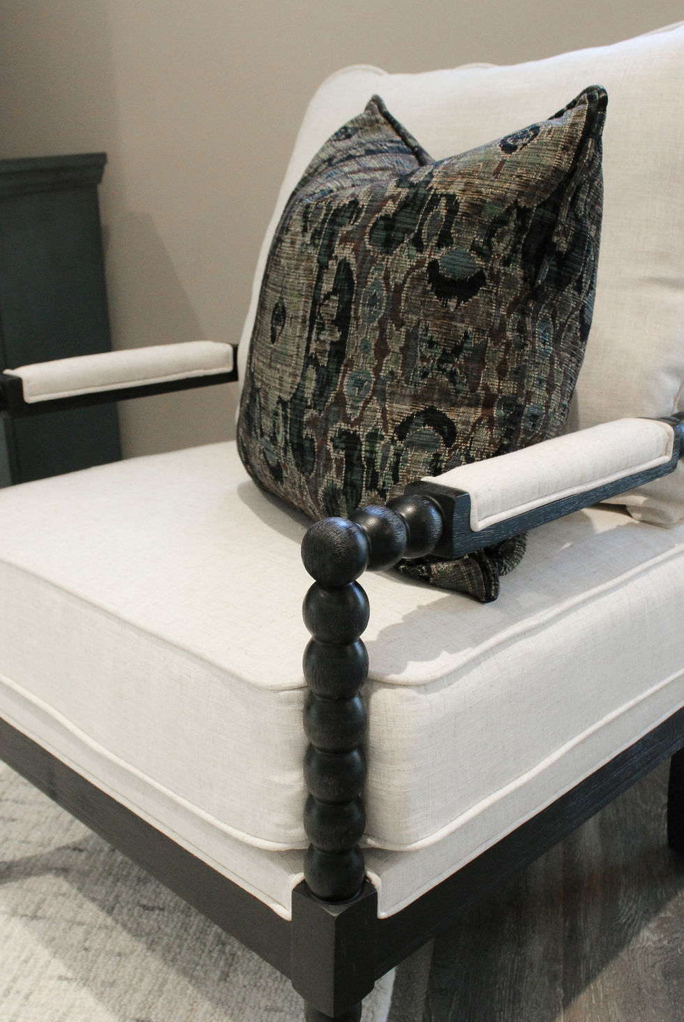 This transitional farmhouse-style living room blends classic comfort with contemporary style, creating a warm and inviting space. Soft tan walls provide a neutral backdrop that harmonizes with a palette of blue, green, brown, and black tones, adding depth and character throughout the room. Traditional black and white accent chairs flank a striking peacock colored media center. Nickel finishes subtly enhance the space with a touch of modern elegance, and a long set of decorative shelves behind the sofa add both functionality and visual interest to the space. The overall design achieves a balanced, layered look that feel both cozy and sophisticated.